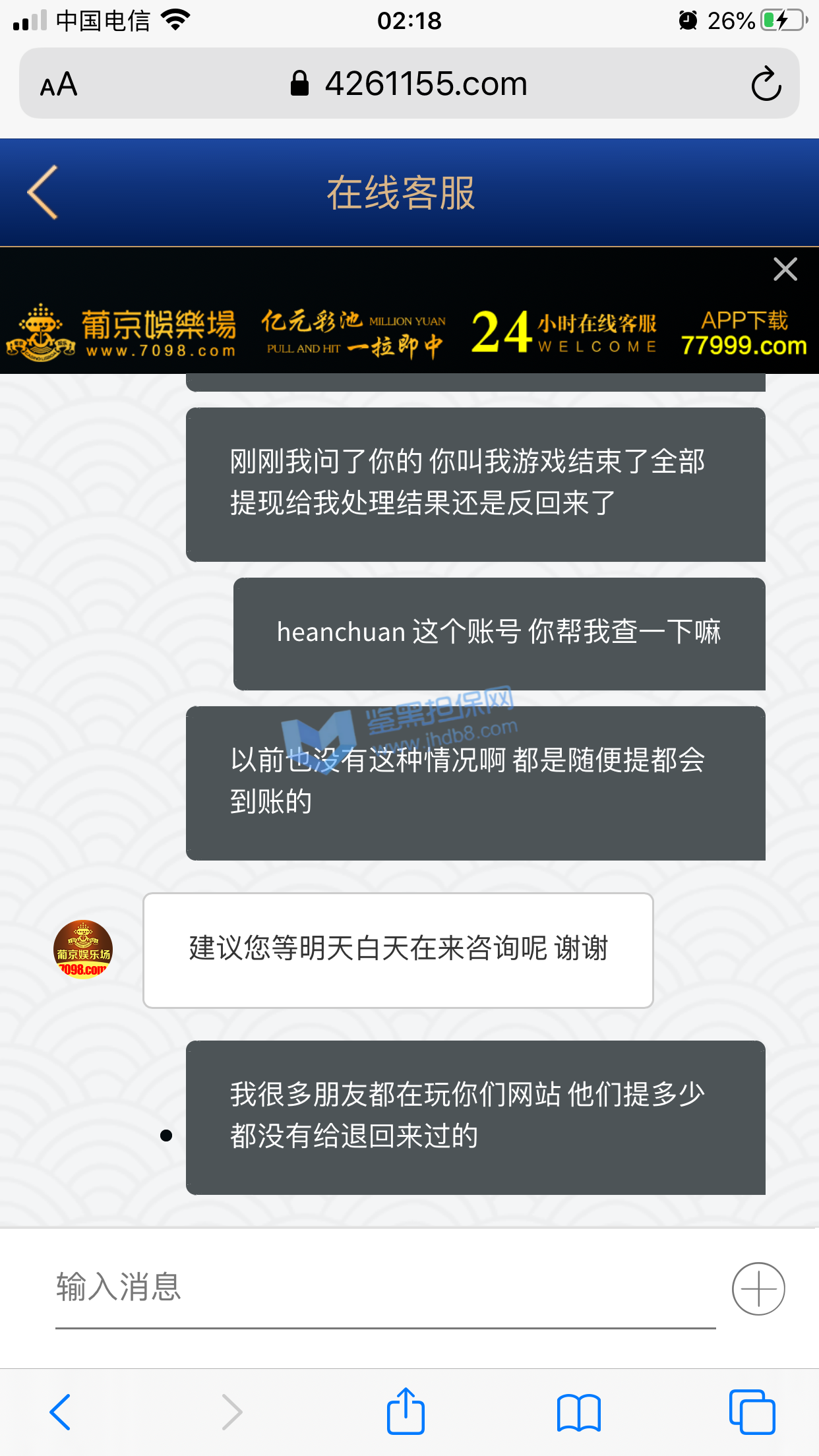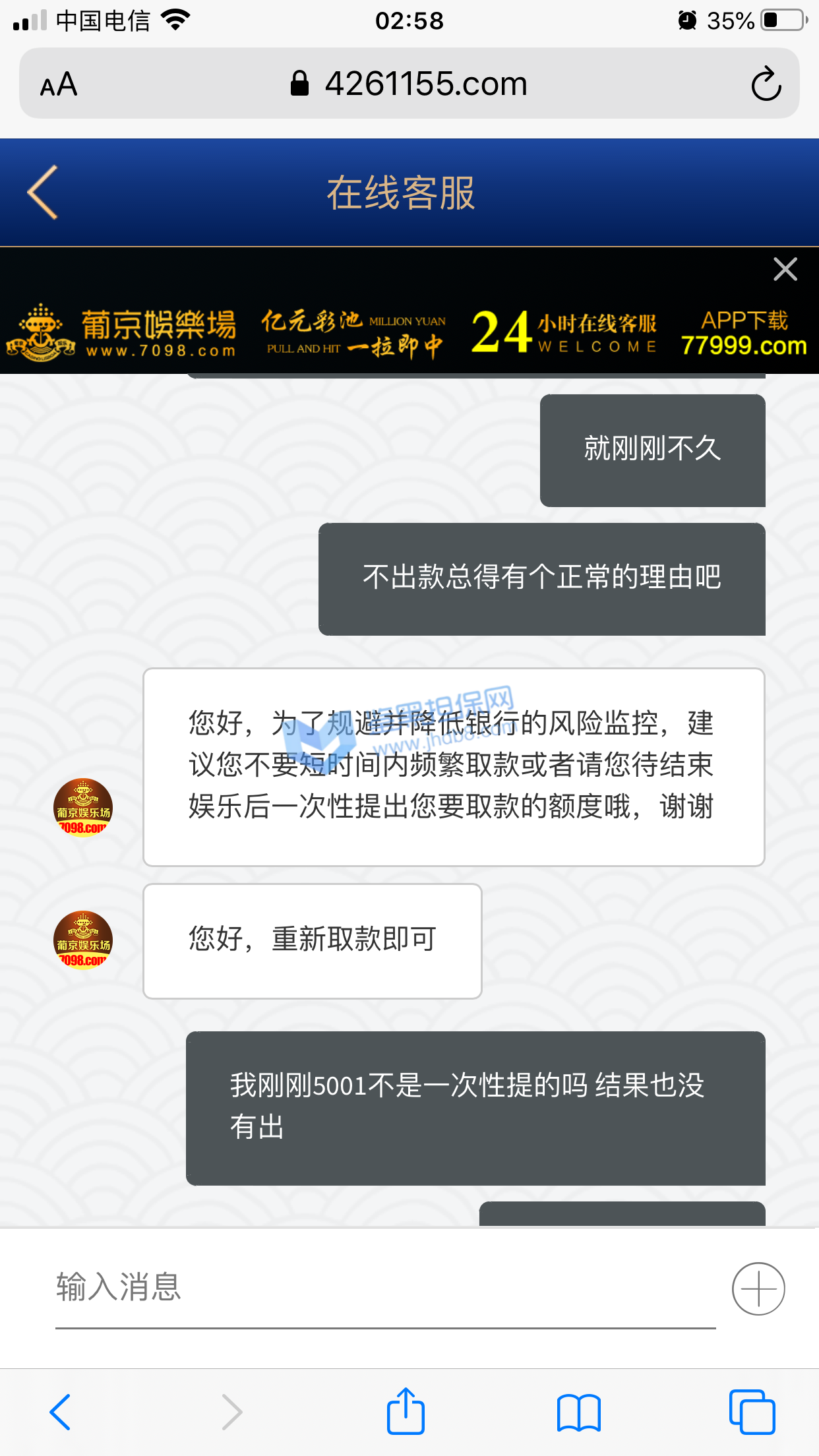 本人账号 ey888888 在6月27日注册的账号,马上就收到了电话回访,说让我参加首存50%,我充值了100领了50输掉了,次日6月28又收到客服电话邀请我再来参加50%,这次充了300 送了150,提现501,先是接到核实银行卡和个人信息,最后说核实完毕,由于我是第一次提现需要把虚拟币的地址发给POP软件的专员,POP这个软件是属于拉黑删除直接自动清空聊天记录的,本人有幸录过充值的视频,请看图1-图3 是和专员客服的聊天记录和充值记录,本人能提供3仅3天的3次的电话通话录音证明是他们电话特邀邀请充值的,本人的确在鉴黑担保网查过他们的官网没有记录当我打开pop聊天软件找专员的时候发个消息在吗聊天记录直接清空了还显示对方不是你的好友,当我重新登录平台的时候显示密码错误,直接修改客户会员的登录密码,找客服就说什么电子套利不做任何解释,本人仅3天都是只用流量进行游戏,玩了MG电子 和PG电子,本人只有一个账号 名下只有一张银行卡,没充值之前一口一个哥哥发那个语音夹子的说,还劳逸结合,有空再来,赢钱了提现直接相当于封号了,次平台多个POP专员 XX001 - XX0012 目前我知道有12个专员XX+后面的数字 001-012排序过去的,估计追回渺茫了,除非鉴黑团队能联系到比客服还高级别的管理。