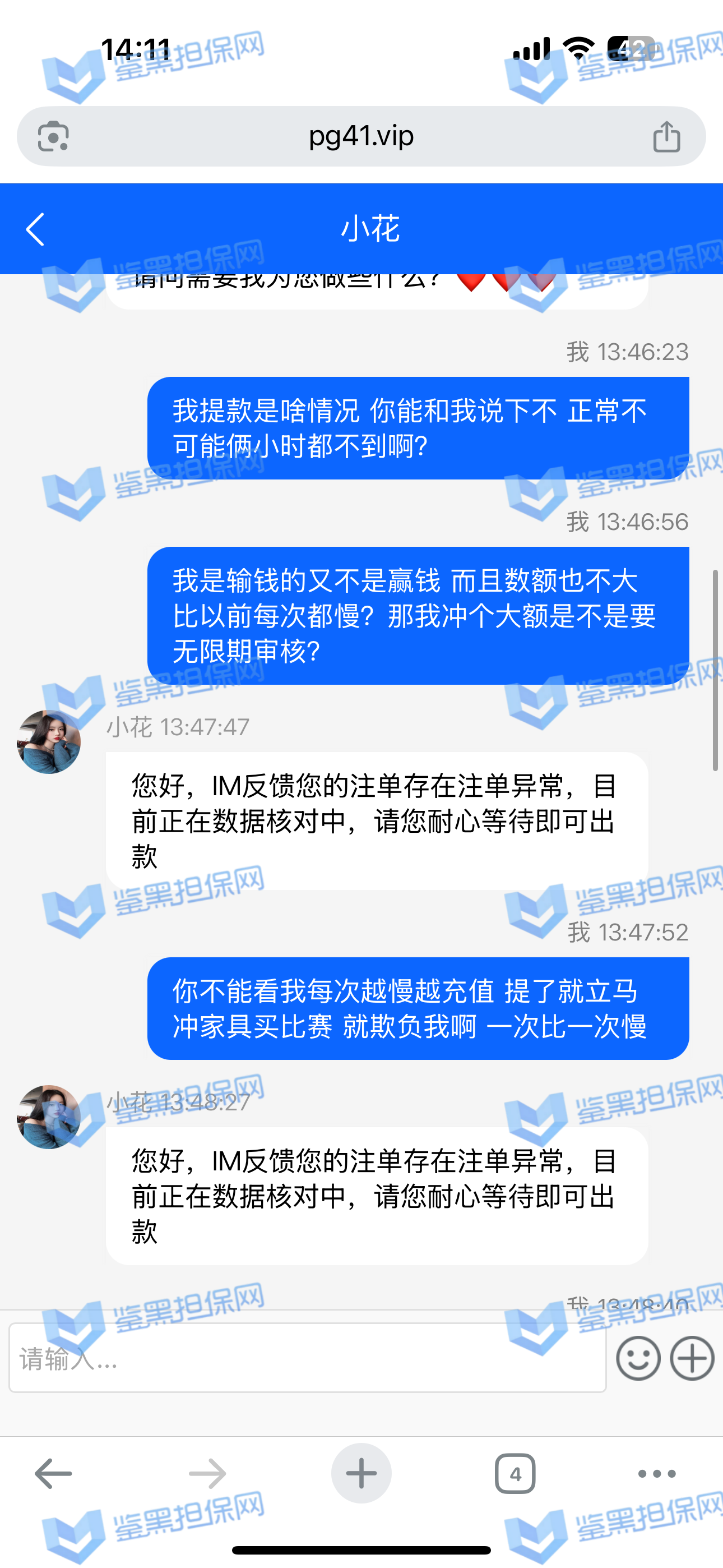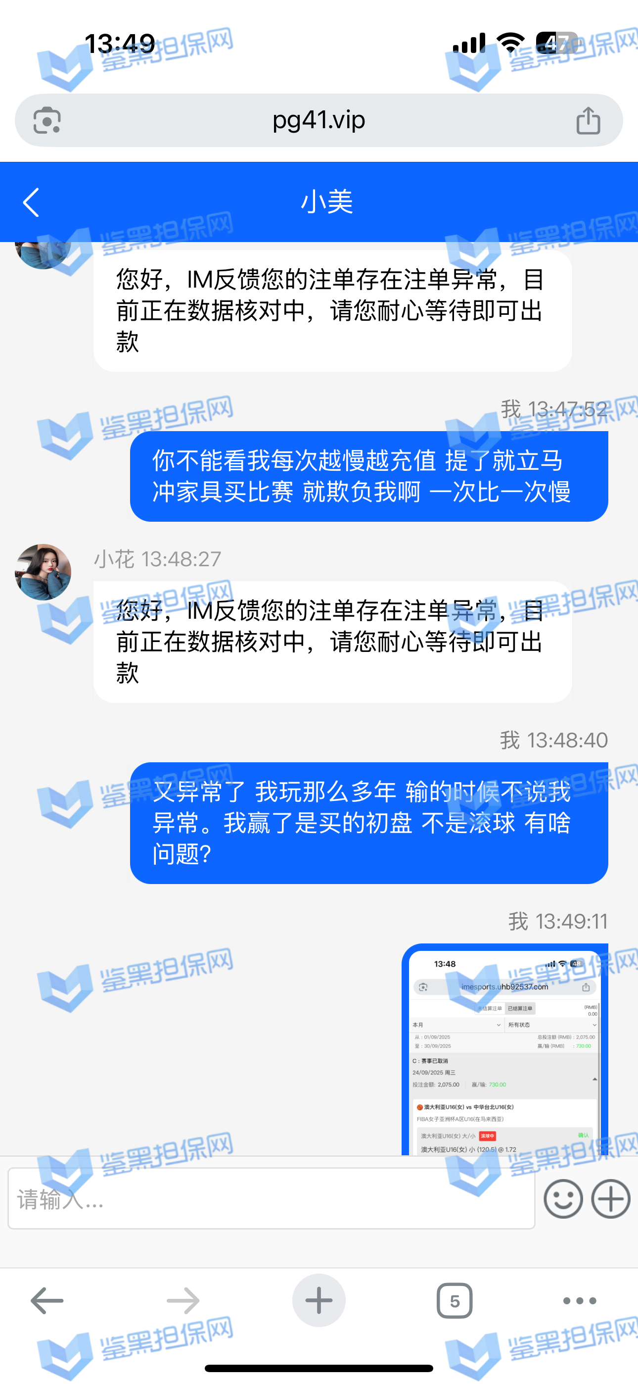 2、鉴黑担保网维权专员联系该平台相关负责人核实情况,对方表示IM注单涉嫌存在异常,IM体育平台抽查审核,需要等待审核结果,若审核无异常会尽快出款,维权专员沟通协商要求催促审核进度,要求重视用户游戏体验以及平台信誉等问题,对方说明后表示会尽快完成审核,请耐心等待。
